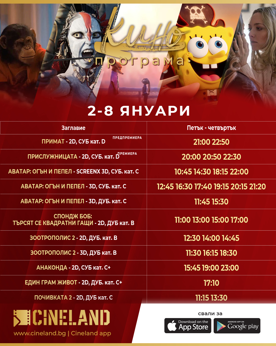 🎥 Кино програма „CineLand София" - 02.01 – 08.01.2026 г.