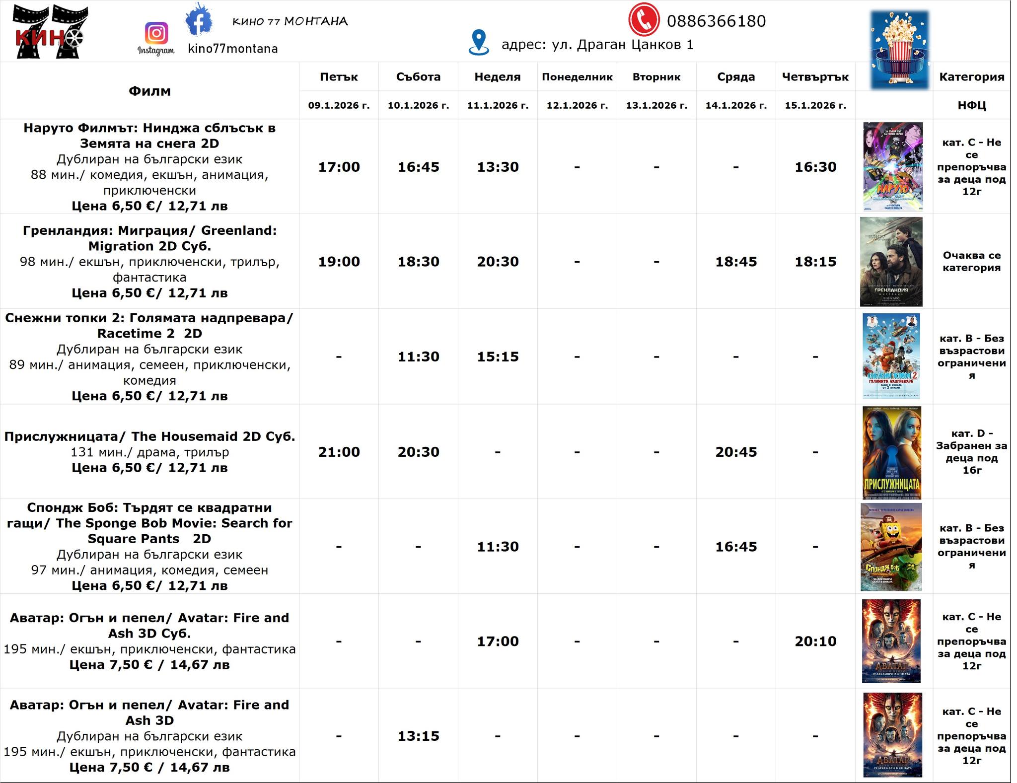 🎥 Кино програма „Кино 77 Монтана" - 09.01 – 15.01.2026 г.