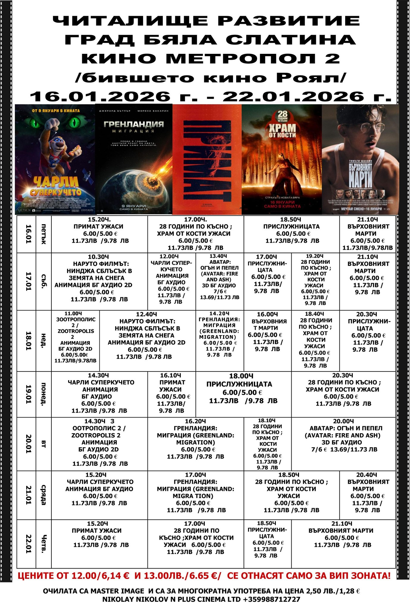 🎥 Кино програма „Кино Бяла Слатина" - 16.01 – 22.01.2026 г.
