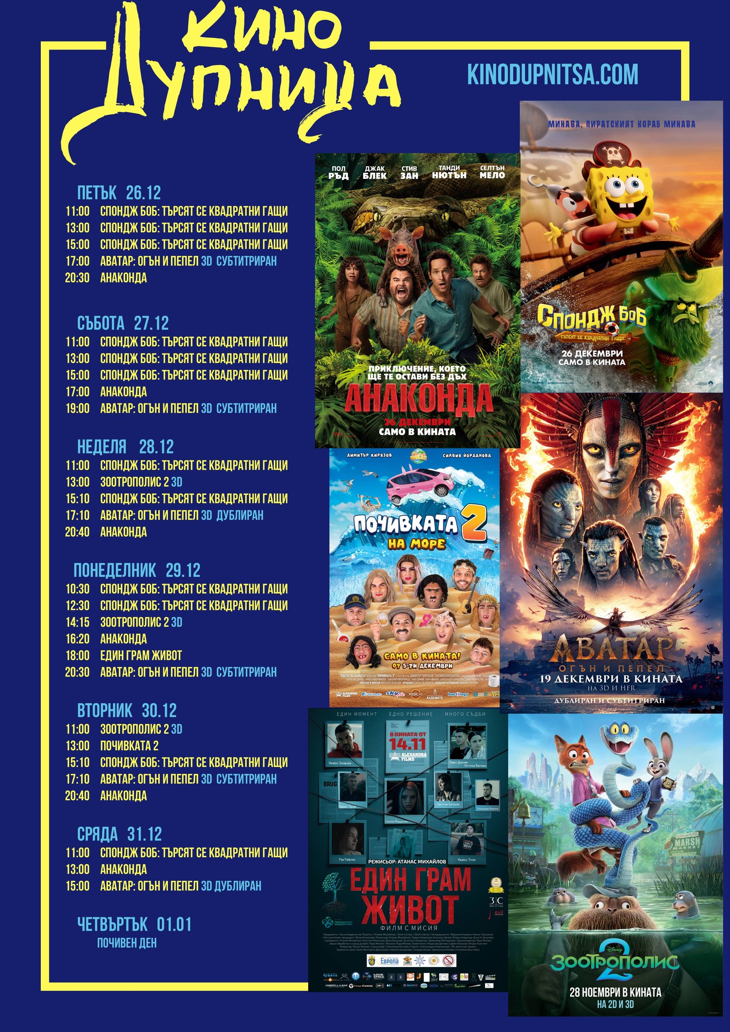 🎥 Кино програма „Кино Дупница" - 26.12 – 01.01.2026 г.