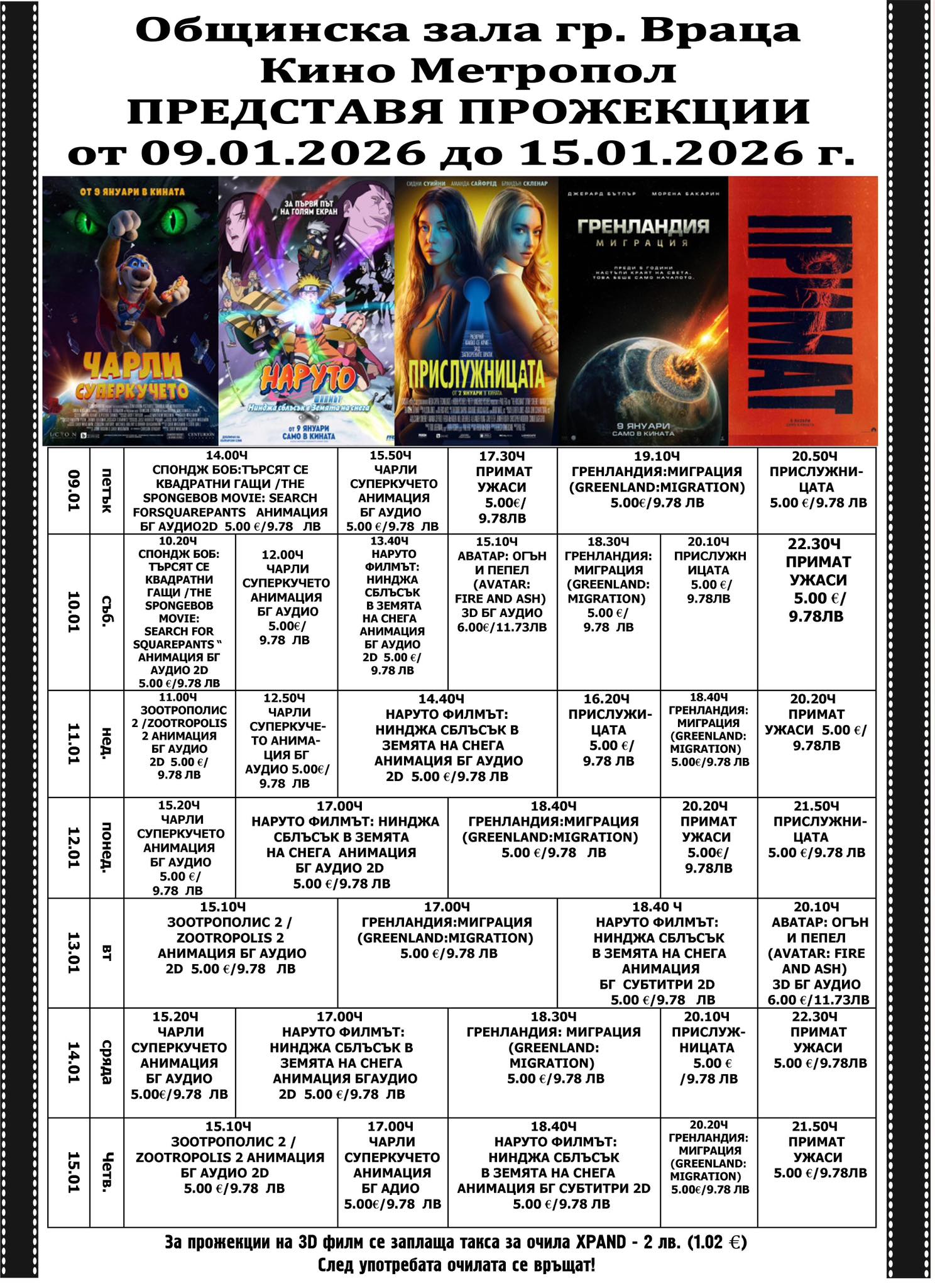 🎥 Кино програма „Кино Метропол Враца" - 09.01 – 15.01.2026 г.