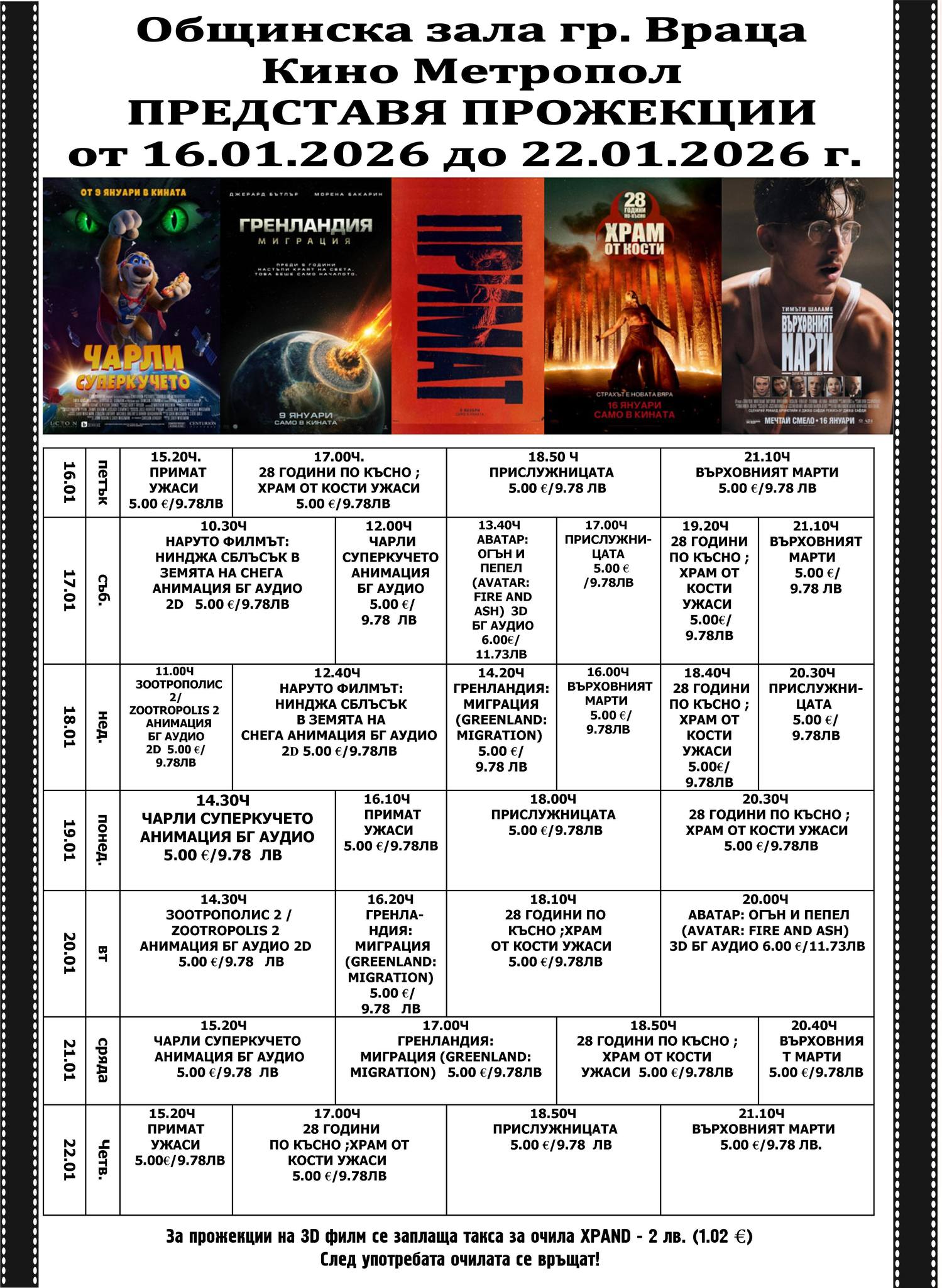 🎥 Кино програма „Кино Метропол Враца" - 16.01 – 22.01.2026 г.