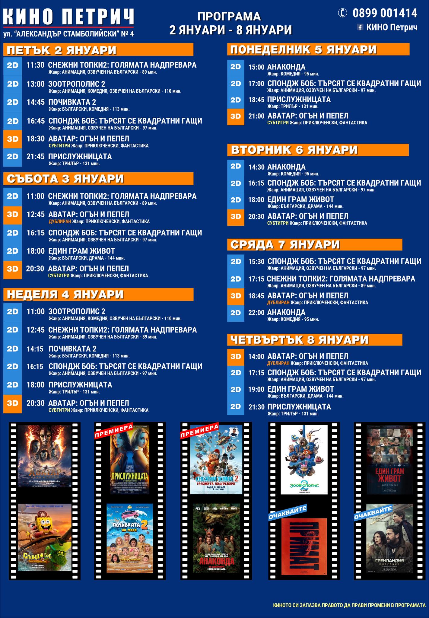 🎥 Кино програма „Кино Петрич" - 02.01 – 08.01.2026 г.