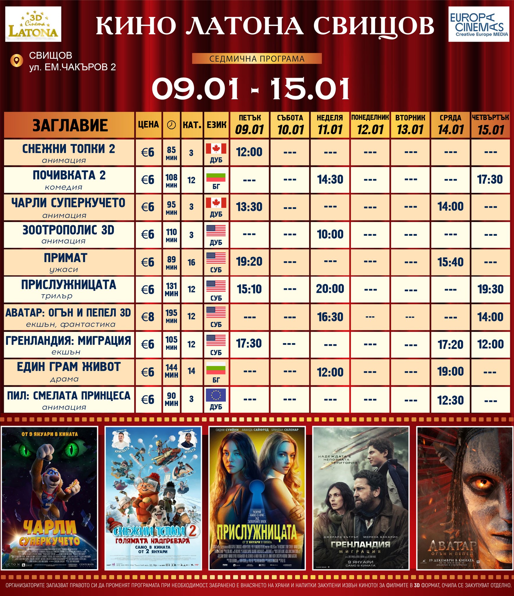 🎥 Кино програма „Латона Синема Свищов" - 09.01 – 15.01.2026 г.