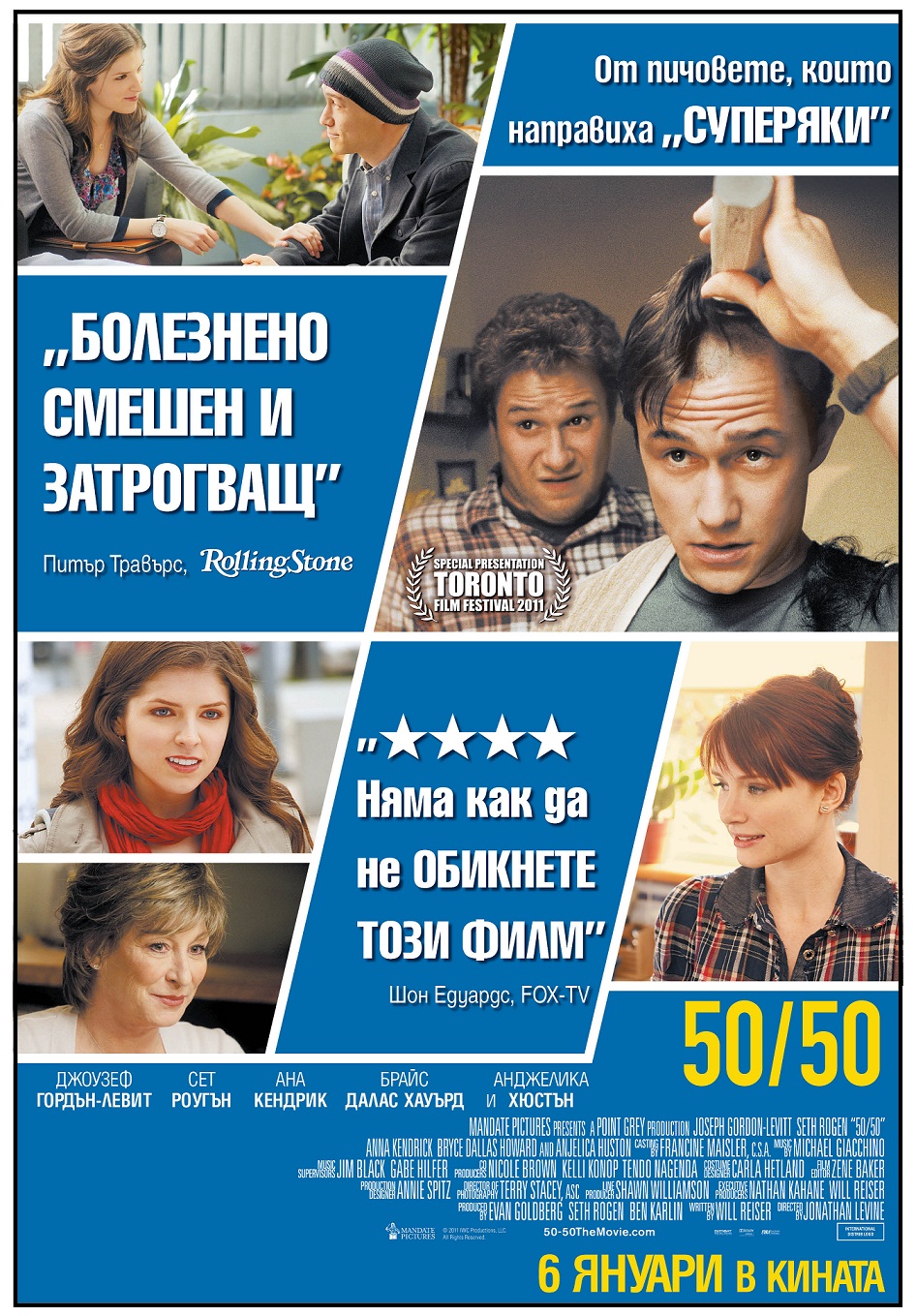 Млад мъж превръща опасна болест в уникална възможност да изживее живота 50/50. Това е забавна, трогателна и оригинална история за приятелството, любовта и оцеляването, където главните роли се изпълняват от Джоузеф Гордън-Левит и Сет Роугън.