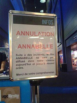 Марсилия, Страсбург, Тулуза, Монпелие, Кретей... Списъкът на градовете във Франция, в които прожекциите на хоръра „Анабел” са анулирани расте всеки ден. Забранен за –зрители под 12-годишна възраст, филмът привлича тълпи от свръхвъзбудени тийнейджъри, които по време на прожекциите се превръщат в образцови вандали. Резултатът са изпочупени и изкъртени кресла, побоища в и извън киносалона, неистови крясъци, съпроводени с уриниране и храчене навсякъде.