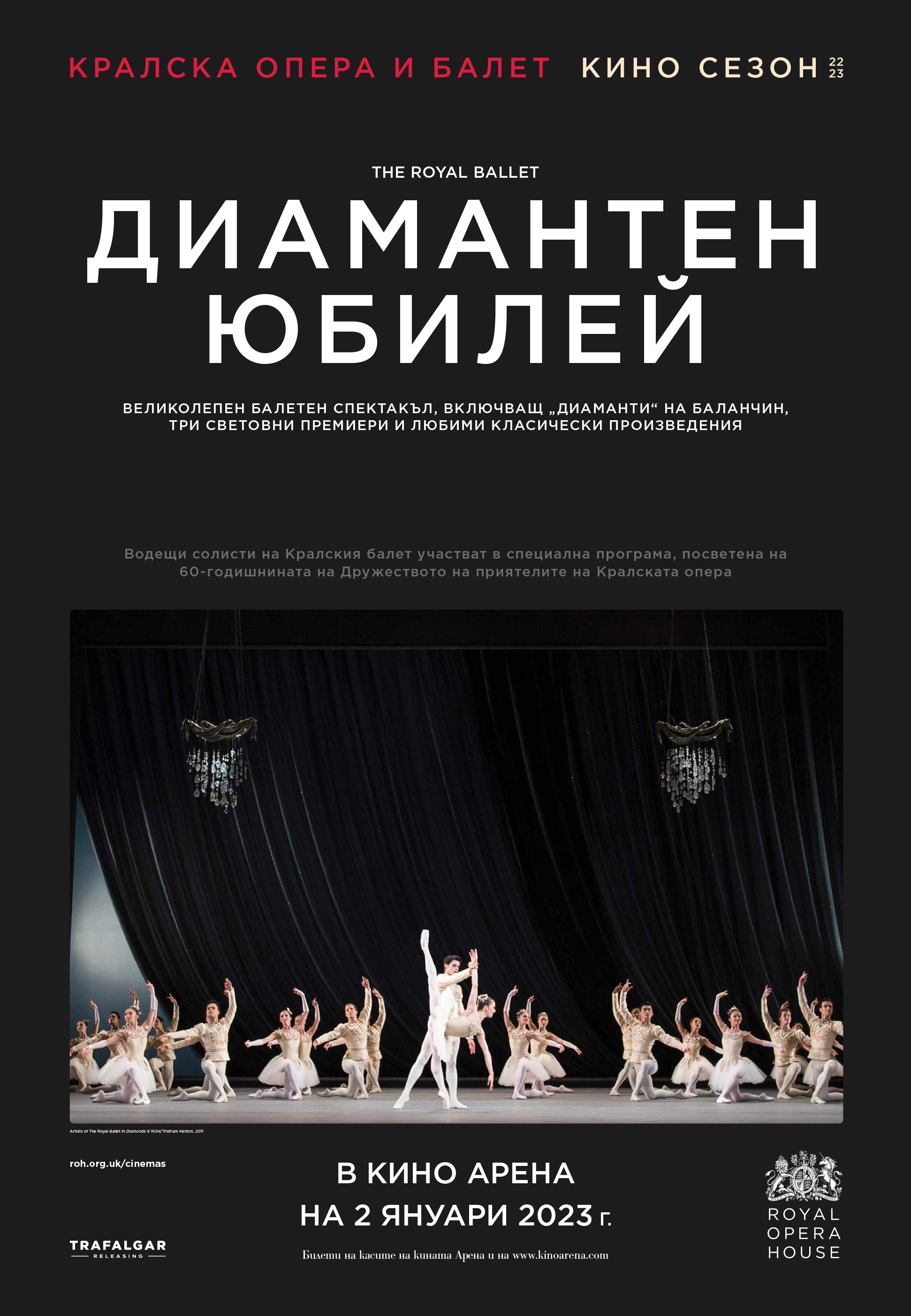 Кралският балет с удоволствие съобщава, че: ДИАМАНТЕН ЮБИЛЕЙ ще бъде излъчен в първите дни на Новата 2023 година в Кино Арена. Представлението ще предложи уникалната възможност да видите зашеметяващ списък от главни танцьори, от най-висока класа в Ковънт Гардън, заедно на сцената.