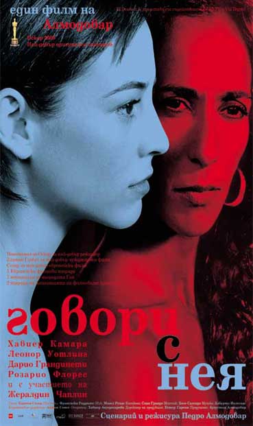 Известен като създател на блестящи женски образи и като “режисьор на актриси”, испанецът Алмодовар все пак не за първи път поставя в центъра на своята фабула мъжки персонажи. Спомнете си “Жива плът”, където няколко мъжете страдат и заплащат скъпо правото си да бъдат обичани. Но като цяло едва “Говори с нея” поставя мъжа в онази привилегирована позиция, която имат жените в киното на Алмодовар. С образа на Бенигно, скромен санитар, който се влюбва в своя пациентка в кома, може би започва нов период в творческите търсения на режисьора. Защото след катарзиса, който преживяха жените от “Всичко за майка ми”, най-важните въпроси за майчинството и синовната обич вече са поставени.