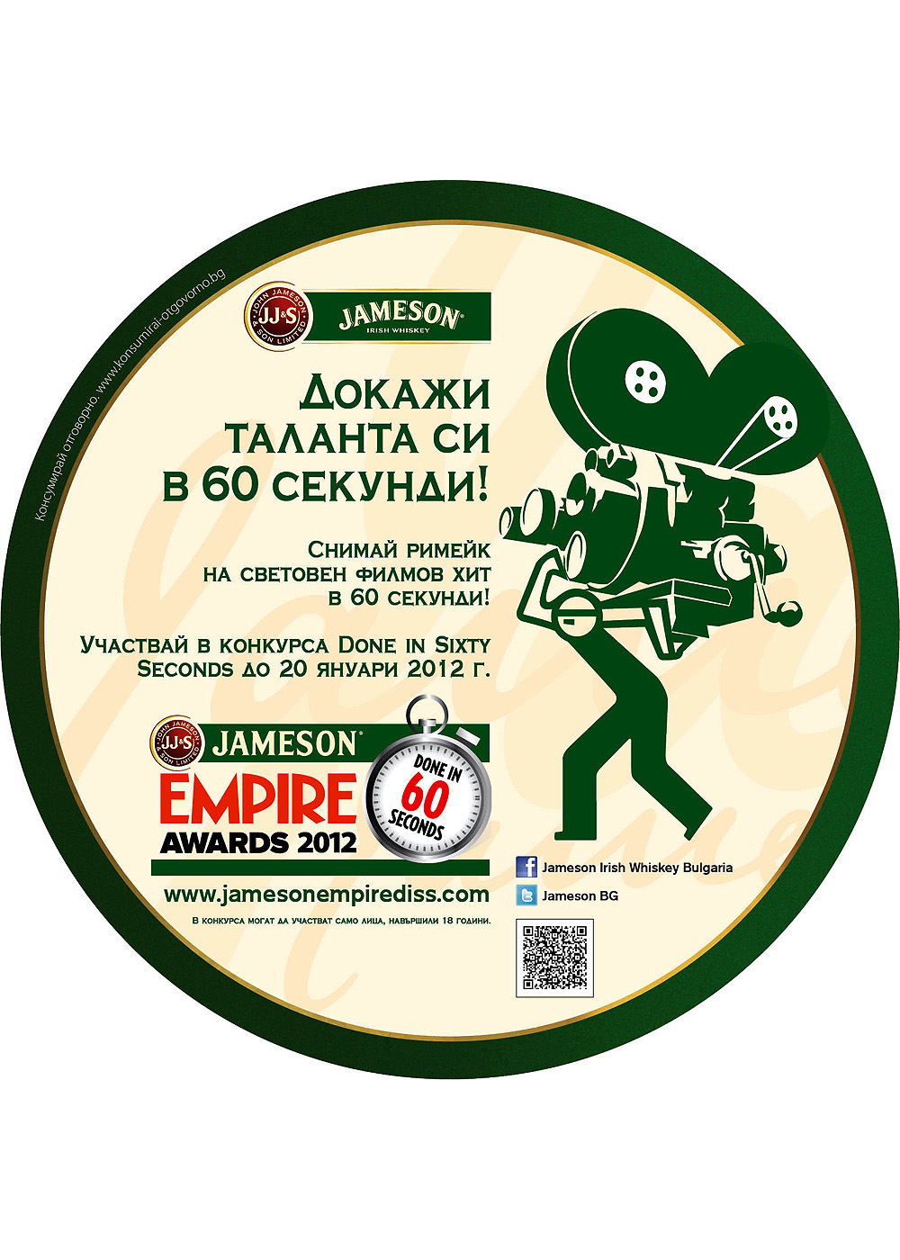 За да участвате в конкурса за голямата награда Jameson Empire Award, за да имате шанса да присъствате на бляскавата церемония по награждаването на победителя през март 2012 г., трябва за направите три неща: съберете приятели, намерете камера и започвайте снимки. Имате 60 секунди, не повече!