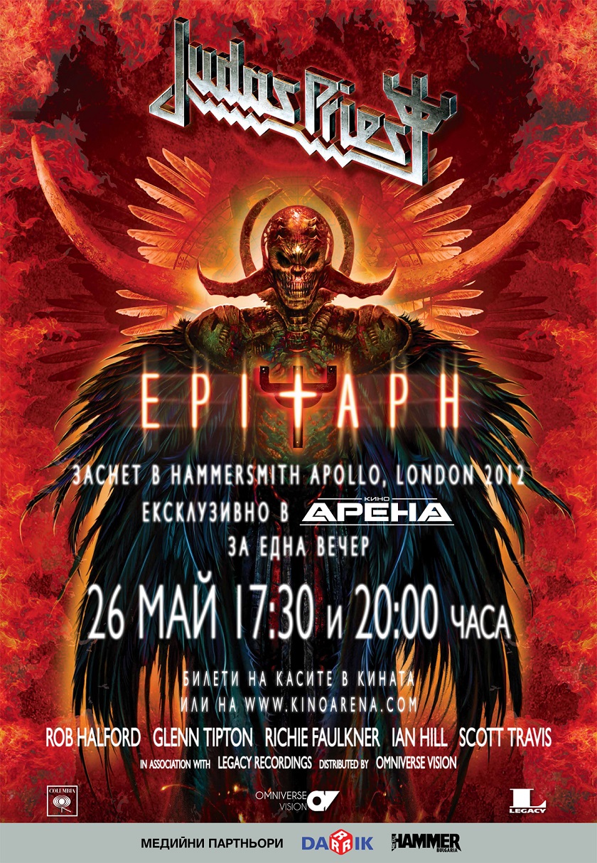 Judas Priest - легендите на хеви метъла, вдъхновили поколения от музиканти и фенове на тежкия саунд, отбелязват 40 години звукозаписна кариера с глобална кинопремиера на заснет на живо концерт EPITAPH. Зрителите ще могат да гледат уникалния и ретроспективен за кариерата на бандата концерт само в кината Арена в цялата страна на 26.05 от 17:30 и 20:00 часа. EPITAPH е заснет на живо от HAMMERSMITH APOLLO в Лондон през май 2012 г. и включва 23 наелектризиращи класически хитове на Judas Priest от всичките 14 албума на бандата (1974 г. до 2008 г.) Освен в България концертът ще бъде излъчен в кината в 20 страни в цял свят.