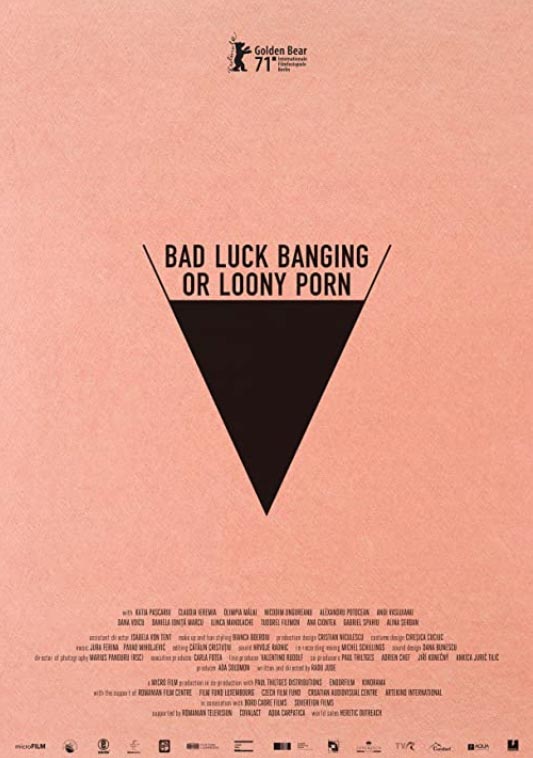 Новата социална сатира на румънския режисьор Раду Жуде „Каръшко чукане или шантаво порно“ („Bad Luck Banging or Loony Porn“), носител на „Златна мечка“ за най-добър филм на Берлинале 2021, проследява несгодите на учителката Еми, която осъзнава, че кариерата и репутацията ѝ са сериозно застрашени, след като в интернет се появява порно-видео с нейно участие. Еми отказва да се поддаде на обществения натиск, макар че може да се окаже изкупителна жертва, върху която се трупат чужди грехове.