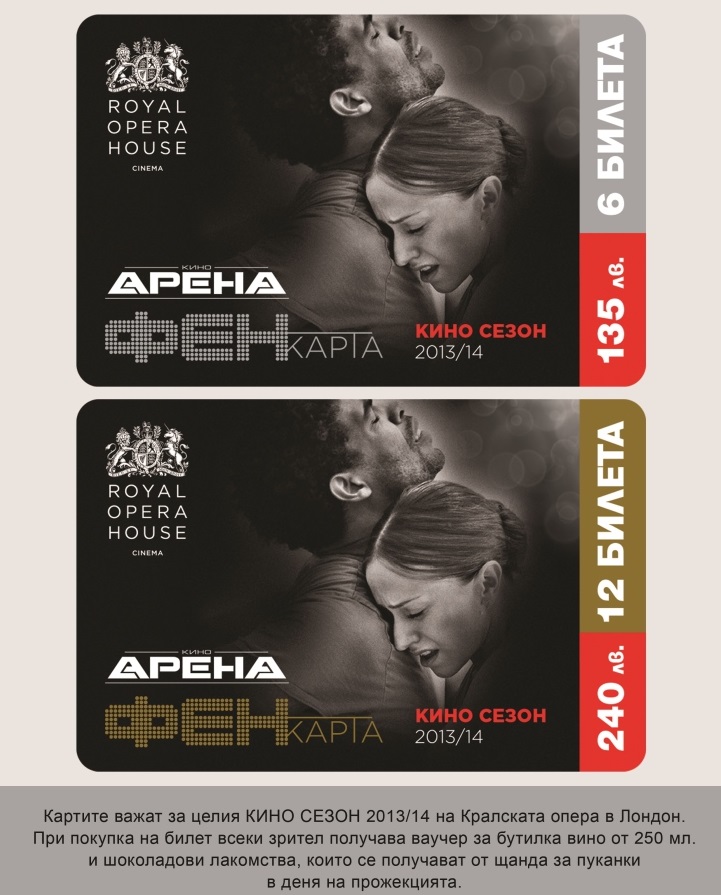 Кино Арена пуска в продажба Royal Opera House ФЕНкарти за 6 и 12 билета, които могат да бъдат използвани през целия КИНО СЕЗОН 2013/14 за една или няколко постановки. Цената на картата за 6 билета е 135 лв, а на картата за 12 билета е 240 лв. Картите се продават на касите в кината Арена. При изразходване на билет от съответната карта всеки зрител получава ваучер за бутилка вино* от 250 мл. и шоколадови лакомства, които се получават от щанда за пуканки в деня на прожекцията.