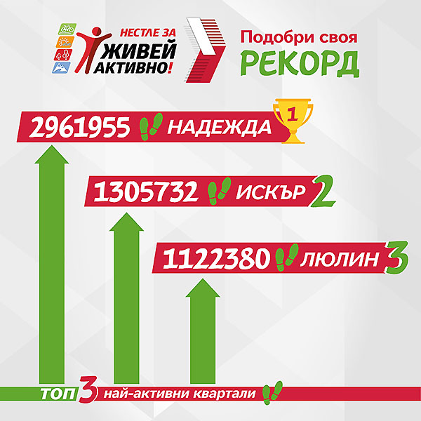 За първи път в столицата се проведе надпревара, която нареди София сред физически най-активните градове в света и определи кой е най-активният квартал на столицата. Зад значението на активен стоят броя изминати крачки за периода 4 – 12 септември от всички жители на отделните квартали, които взеха участие в състезанието. „Виновник“ за тази статистика е най-голямата инициатива за балансирано хранене и активен начин на живот у нас Нестле за Живей Активно!. За 16-та поредна година Нестле България предизвиква всеки да бъде физически активен в своето ежедневие, като най-лесното, което може да направи, е да се придвижва пеша в града.