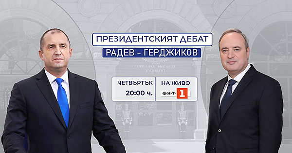 Претендентите за държавен глава с единствения си дебат в национален ефир. Гледайте специалното студио „Президентският дебат: Радев - Герджиков“ на живо в четвъртък, от 20:00 ч., по БНТ 1 и БНТ 4