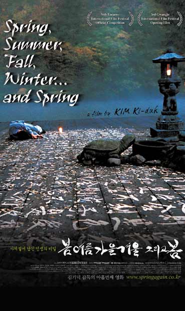 Под зоркия поглед на Стария монах Младия получава суров урок за естеството на скръбта, когато детинските му игри стават жестоки после той изпитва на гърба си силата на съблазънта, когато млада жена влиза в затворения му свят – желание, което ще доведе до вманиачаване и убийство. Но след горещината и енергичността на пролетта и лятото идва есента (сезонът на размишленията и поправянето на грешките), а най-накрая и зимата – време на пробуждане и просветление. Джована Фулви