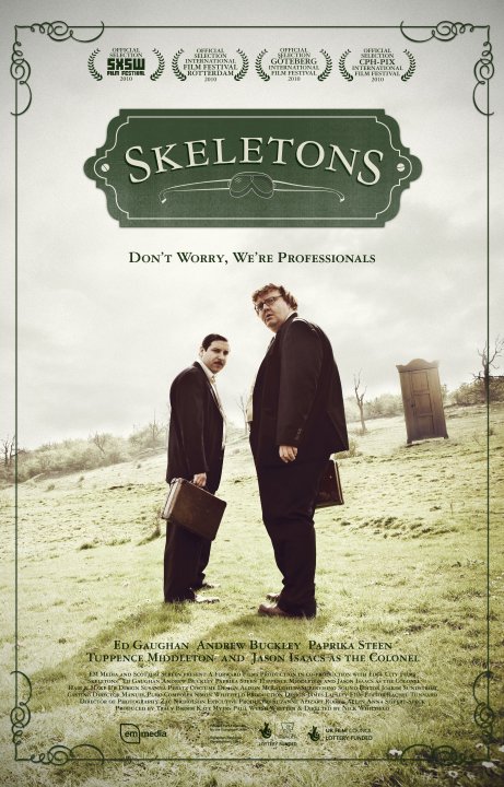 В дебюта си „Скелети” Ник Уитфийлд е сценарист и режисьор, въпреки че публиката на Острова го познава добре като актьор в комедийни филми и телевизионни сериали. До голяма степен в „Скелети” той представя и личното си отношение към сериозните теми – с много английско чувство за хумор и задължителната ирония към него. Историята на филма напомня за изключителните традиции на британският комедиен жанр от „Монти Пайтън” до наши дни.