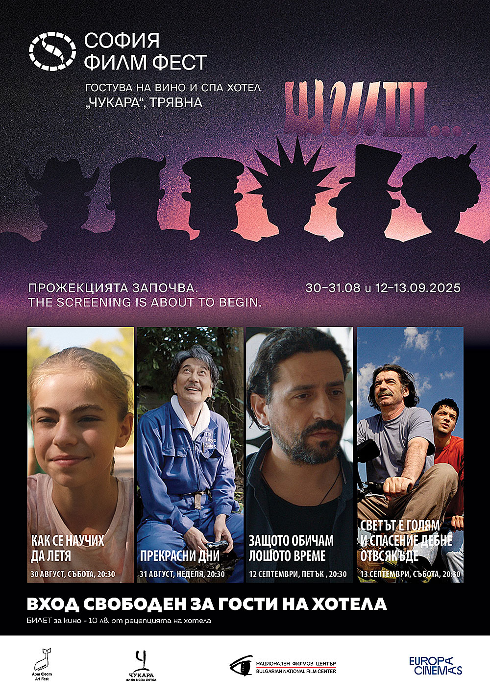Предвидили сме два уикенда с прожекции – на 30 и 31 август (световно кино) и на 12 и 13 септември (българско кино). Прожекциите на всички събития „СФФ на път“ са част от проекта на Арт Фест „СФФ на път 2025“, реализиран с подкрепата на ИА Национален филмов център и паневропейската вериrа киносалони Europa Cinemas.