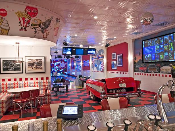 Невъзможно е да не си прекарате страхотно в този център за забавление, вдъхновен от крайпътните ресторанти от 50-те. В залата има кино екран, обграден от стенопис, изобразяващ класическо автокино. Освен това, има и кът за боулинг с невероятен декор. Audio One Sound and Video Inc. от Маями съоръжават домашното кино с 12 говорителя, 2 субуфера и висококачествен прожектор.