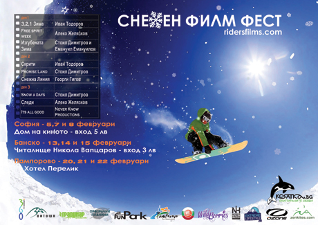 Първото издание на фестивала за филми на зимна тематика и спорт Снежен Филм Фест www.ridersfilms.com - започва на 5-ти февруари в 20 ч. с три зимни филма в столичния киносалон „Дом на киното“. Следващите прожекции в София са на 7-ми и 8-ми февруари отново в 20 ч. на същото място.