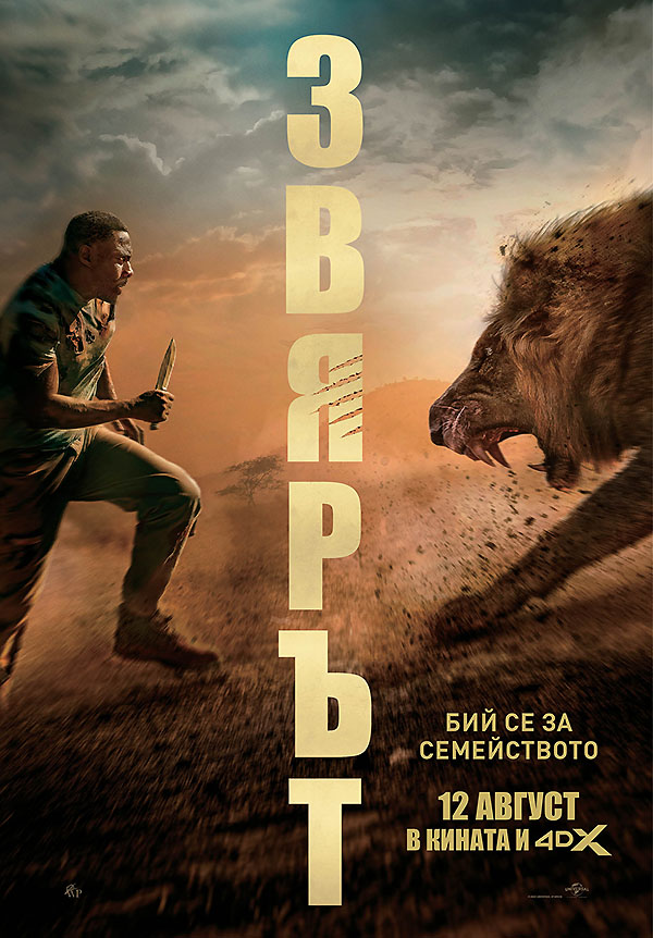 Този август законът на джунглата е единственият, който има значение. Световната звезда Идрис Елба (Бързи и яростни: Хобс и Шоу) и режисьорът Балтазар Кормакур (Еверест) ще ни отведат дълбоко в красивите, но опасни простори на африканската савана и ще ни изправят лице в лице със Звярът. В ускоряващия пулса напрегнат трилър, баща и двете му дъщери се оказват преследвани от гигантски свиреп лъв, жаден за човешка кръв. Борете се за оцеляване – в природата има място само за един върховен хищник.