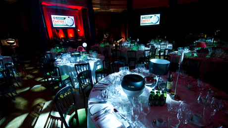 Мястото се оказа балната зала на хотел "Мариот", на "кралския" бряг на Темза, до нея се добрахме през навалица от даващи автографи знаменитости, истерично подвикващ шпалир и гора от телевизионни камери. Вероятно и усещането около "Кодак тиътър" е същото... Формулата се оказа като в петъчната вечер, само мащабът на лустрото и цените на тоалетите (най-вече дамските) бяха скочили до небесата. Пак reception drink в кънтящо мраморно лоби, където никой не чуваше никого, но всички говореха широко усмихнати. После по отрупаните кръгли маси в аристократичната зала, картонче с името на всеки бе дискретно поставено до сребърните прибори.