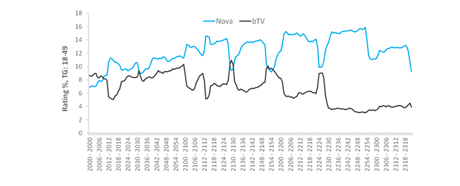 С дял от 38.8 % от всички зрители в активна възраст (18-49 години), гледали телевизия по това време, Нова се оказва с почти 2 пъти по-голяма аудитория от втората телевизия в класацията – bTV (с дял от 20.9%). Разликата между двете телевизии е дори по-голяма сред младата телевизионна аудитория (на възраст 18-34 години), където Нова отчита дял от 44.1%, докато следващата телевизия привлича едва 20.7% от гледащите в този момент.