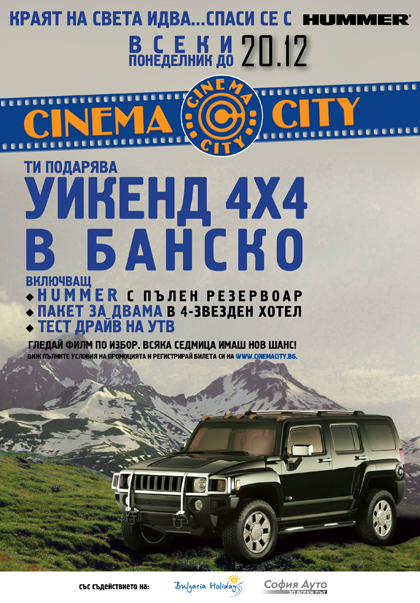 Cinema City стартира промоция „УИКЕНД 4Х4 В БАНСКО”. Всички зрители на Cinema City и Mtel IMAX имат шанс да спечелят уикенд в Банско, включващ пакет за двама в четиризвезден хотел в Банско, тест драйв на новата маниашка оф-роуд машина УТВ на място и ползване на HUMMER с пълен резервоар през уикенда.