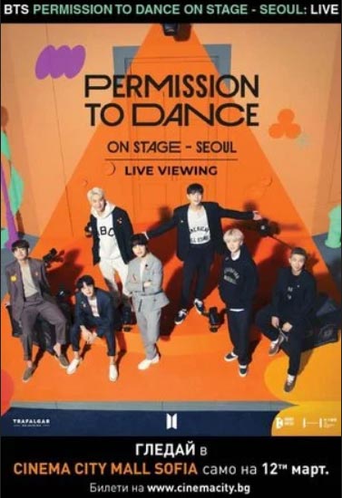 BTS PERMISSION TO DANCE ON STAGE - SEOUL’ ще има една прожекция с излъчване на живо само в Cinema City Mall of Sofia и по-късно в същия ден още едно повторение на запис отново само в Cinema City Mall of Sofia. Присъединете се към нас, докато BTS и АРМИТА стават отново едно с музиката и танците в едно незабравимо концертно изживяване на живо, излъчвано от Сеул до кината по целия свят! „BTS PERMISSION TO DANCE ON STAGE - SEOUL“ е най-новата част от световното турне на поп иконите на 21-ви век BTS, включваща разтърсващи изпълнения и най-големите хитове от цялата им невероятна кариера. Предишните излъчвания в Лос Анджелис бяха гледани от приблизително 813 000 души, което ги прави едни от най-успешните излъчвания през 2021 г. Не пропускайте „BTS PERMISSION TO DANCE ON STAGE - SEOUL“, за да видите RM , Jin, SUGA, j-hope, Jimin, V и Jung Kook на големия екран в Cinema City само в събота, 12 март.