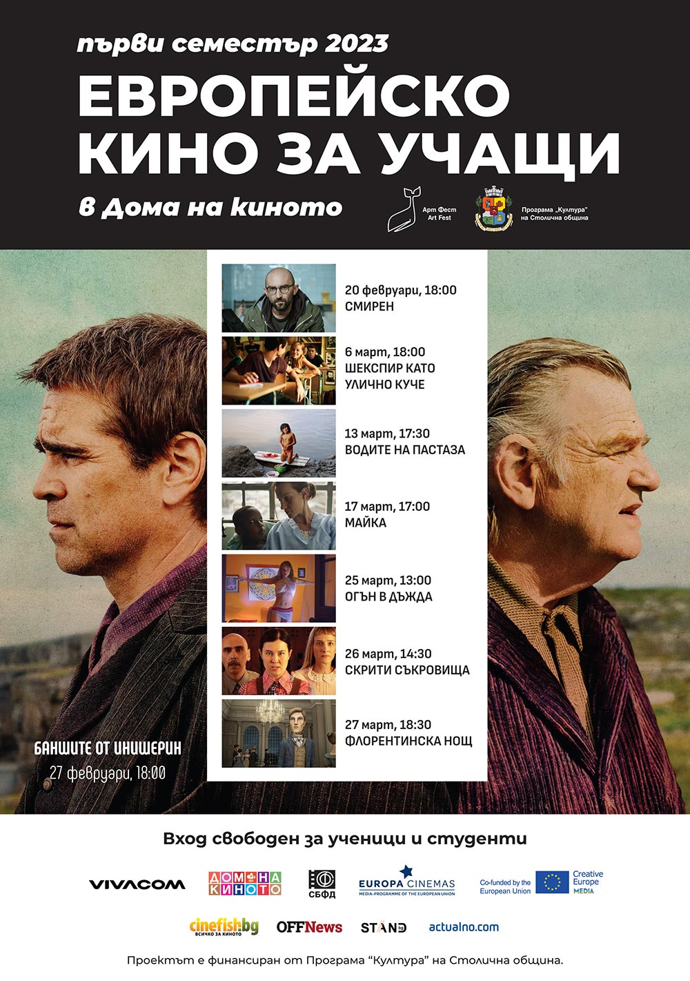 Първият семестър на инициативата „Европейско кино за учащи“ включва прожекции на осем филма и един майсторски клас, които ще се проведат между 20 февруари и 27 март 2023. Програмата показва избрани заглавия от съвременното европейско кино на ученици и студенти при вход СВОБОДЕН. Филмите ще бъдат представени от режисьорката и основател на филмовата школа „Кино Клас“ Надежда Косева и програмния директор на Дома на киното Христо Христозов, а след края на прожекциите са предвидени дискусии с младите зрители.